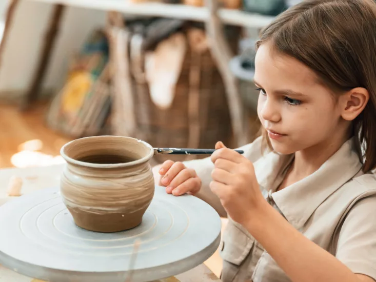 Курс, который объединяет ремесло, историю, эстетику и практический навык. Дети проходят путь от проминки глины до обжига и создания изделий. Изучают виды форм, декора, сушки, направления в керамике (интерьер, сад, аквариумы и др.)